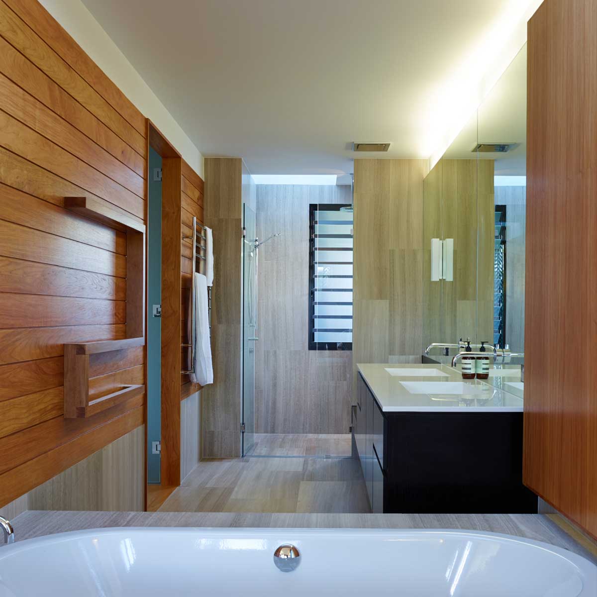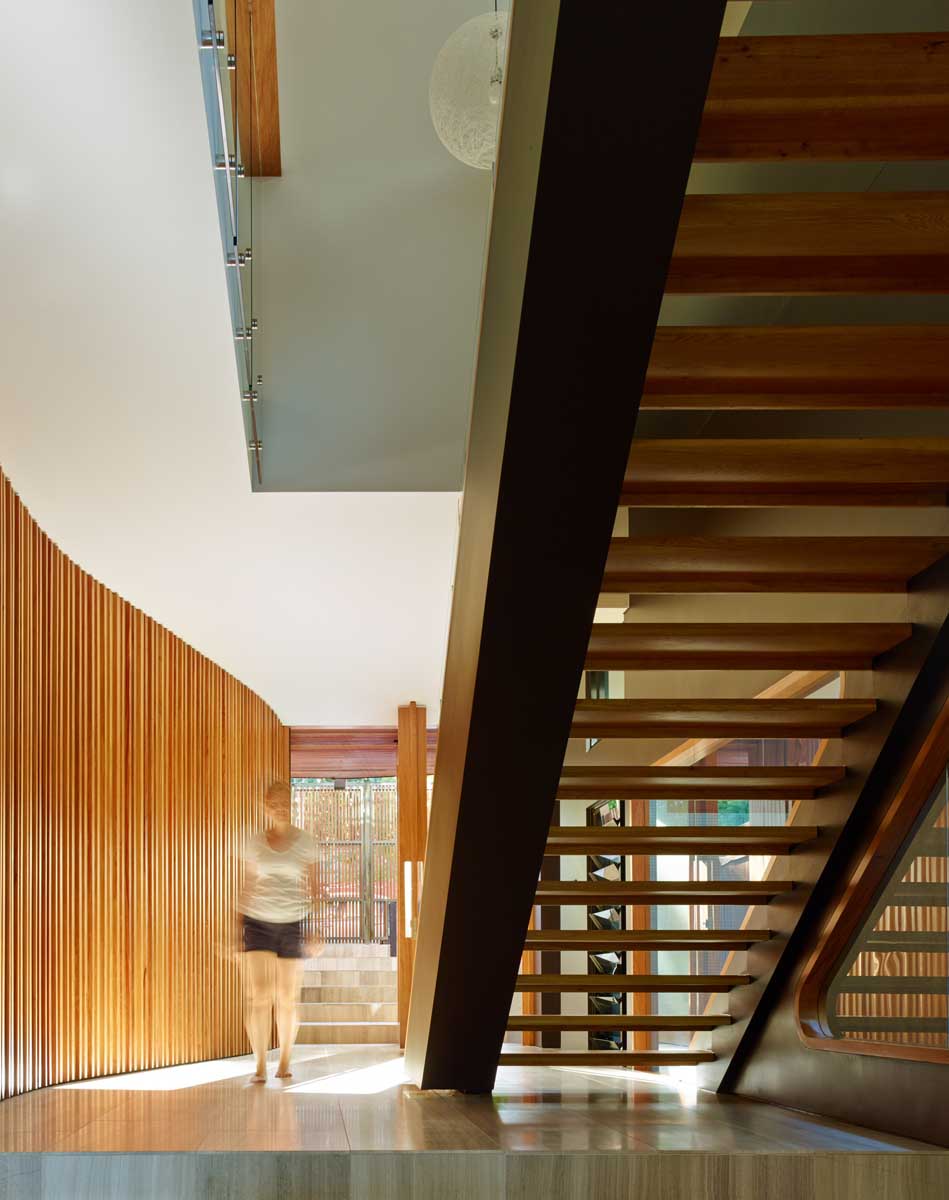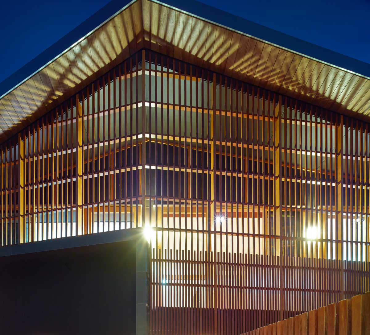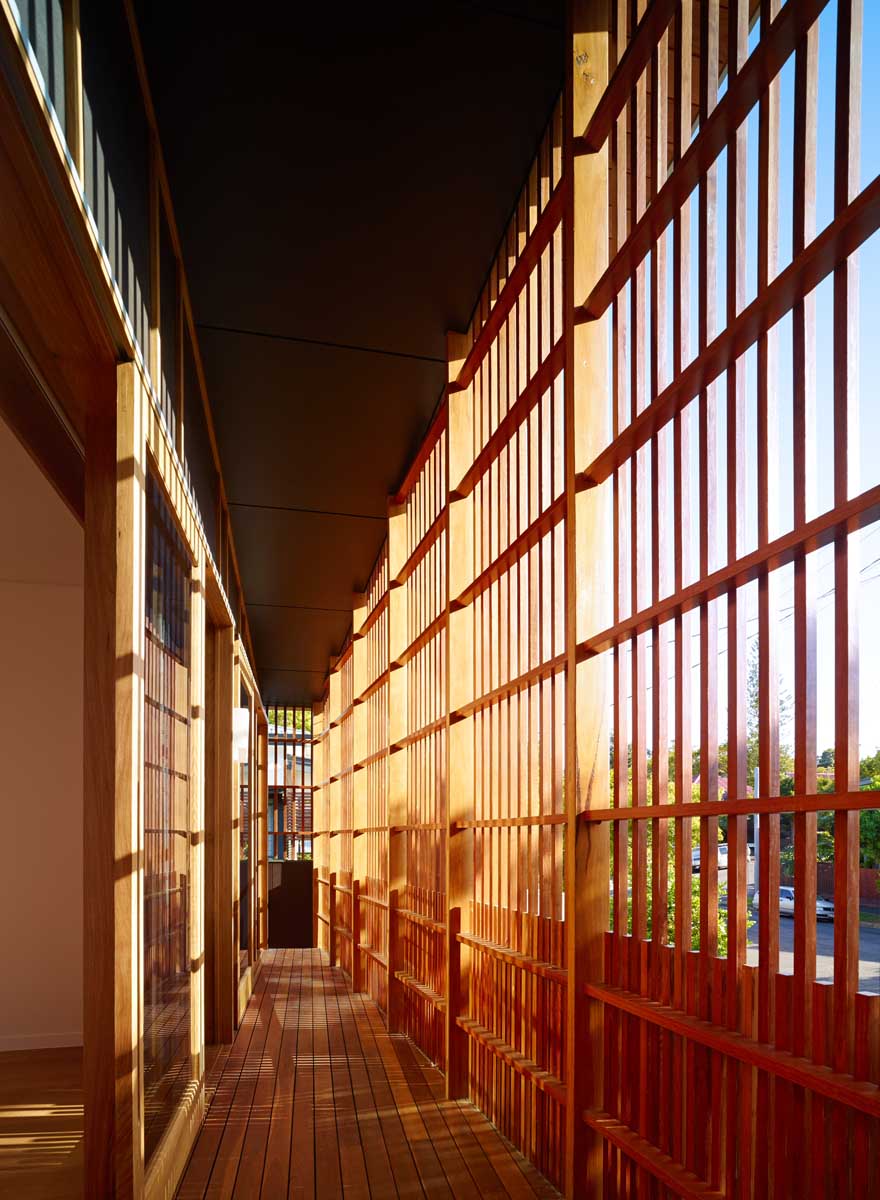 The striking rosewood facade is one of the defining features of this project, providing an ever changing play of dappled light and shade.