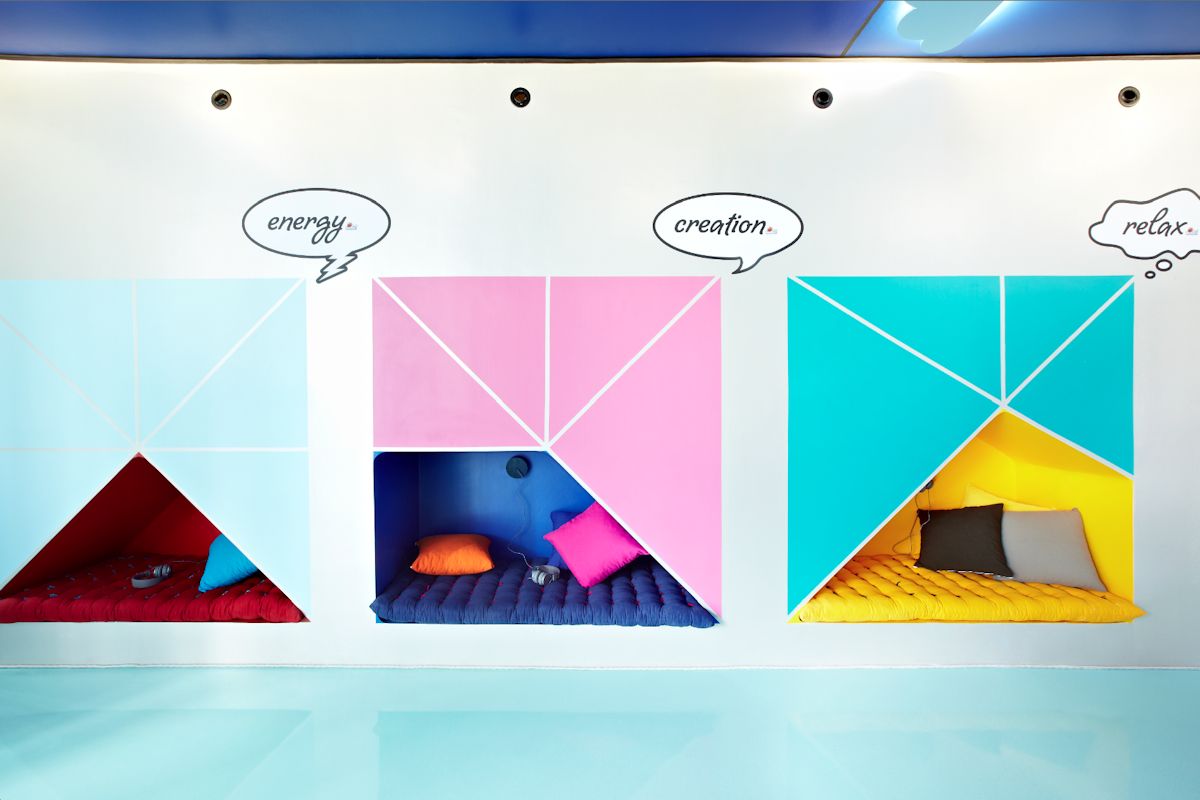 Cushioned niches where kids can relax and feel the blends of essential oils, color therapy, and binaural hearing therapies that induce creativity, relax or energizing.