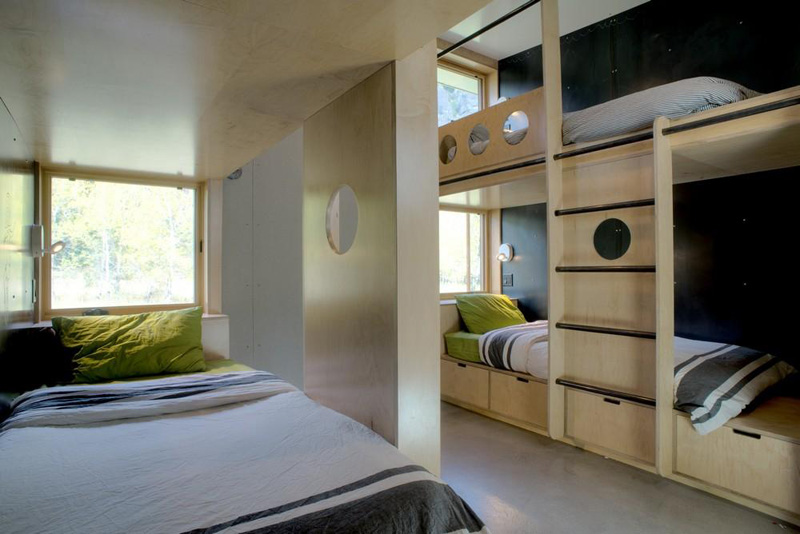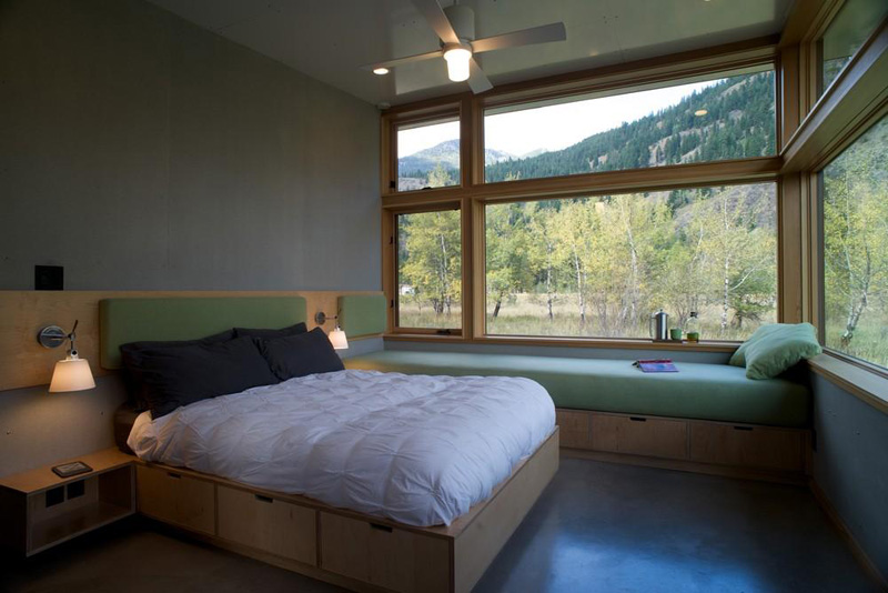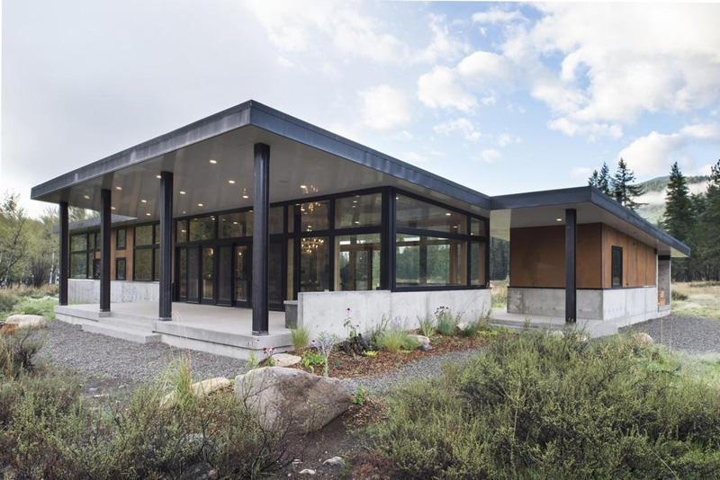 A simple material pallet focuses on highly durable, low maintenance solutions such as Cor-ten steel siding, aluminum clad windows and a concrete skirt that protects the structure’s base during the winter snowpack and spring snowmelt cycle.