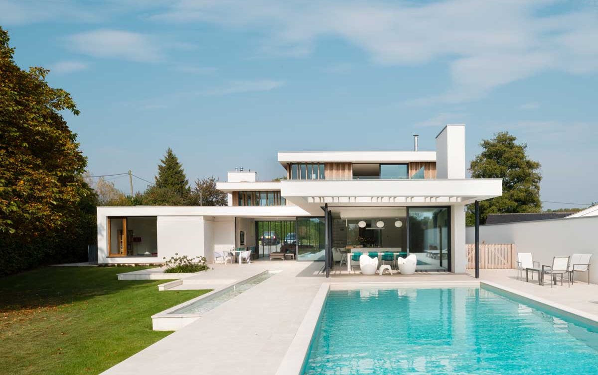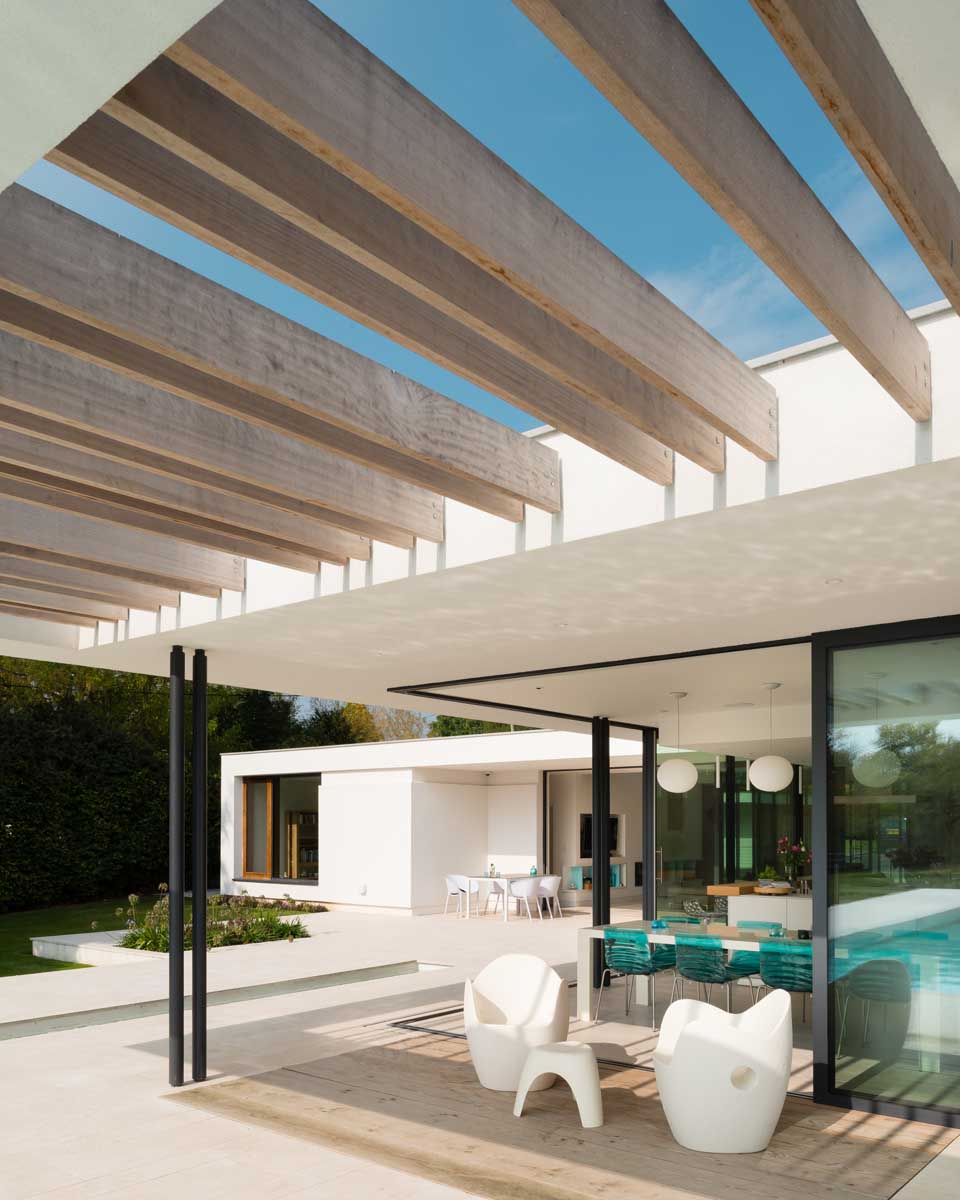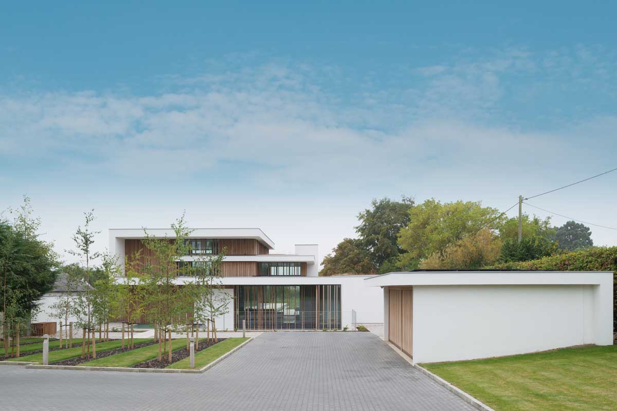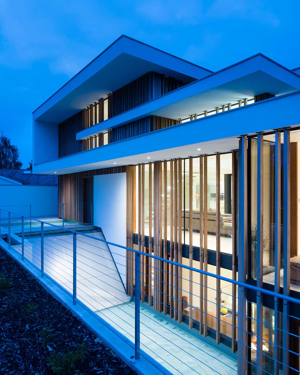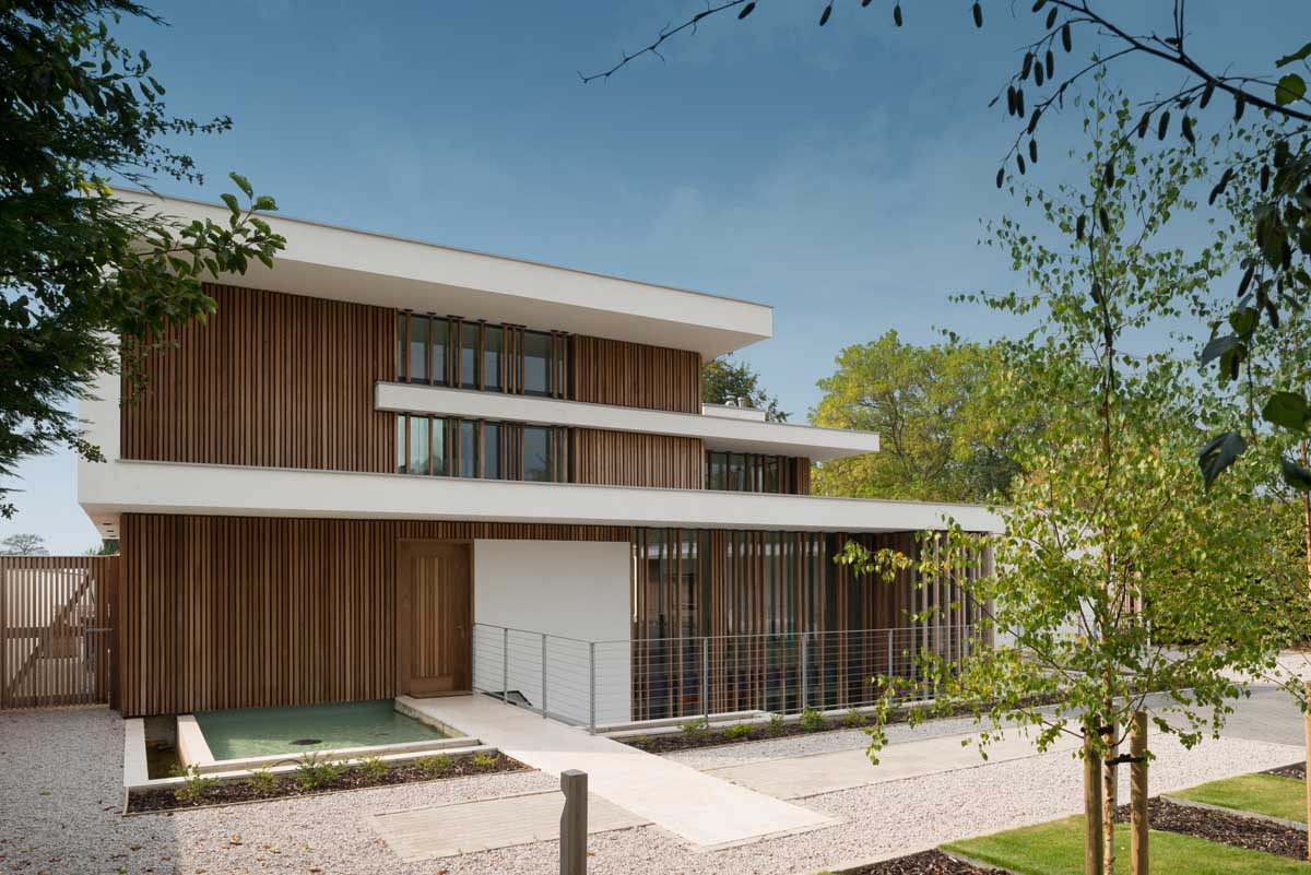 The articulation of the form has been rigorously pared down to two contrasting interacting elements consisting of crisp white, predominantly horizontal, folding planes inlaid with richly textured randomised vertical timber battens. The untreated, responsibly sourced Iroko, which is traditionally used in boat building, references the river and allows the white planes to float. This is reinforced through the reflections from the entrance water feature and swimming pool on the white soffits of the canopy planes. A gentle sound of trickling water permeates throughout the house reinforcing the serene river setting.