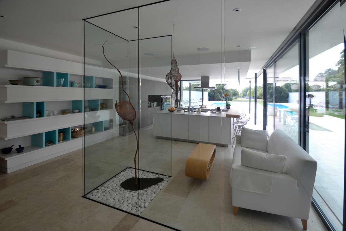 A series of spaces, surfaces, touchstones and volumes set up a journey through the house and define zones within the open plan layout. The approach to the house bridges across a water feature which acts as a lightwell for the basement accommodation. A double height space which affords views through to the rear garden marks the entrance whilst a sculpture set within a glazed niche draws you through the house. The central space of the living area is defined by timber inlaid into the limestone floor and by clerestory glazing which floods the space with light. A further inlaid timber floor which extends externally past the line of glazing, defines the dining area and breaks down the boundary of inside vs outside. Both the floor level and canopy soffits extend out flush with internal levels to accentuate the inside and outside relationship.