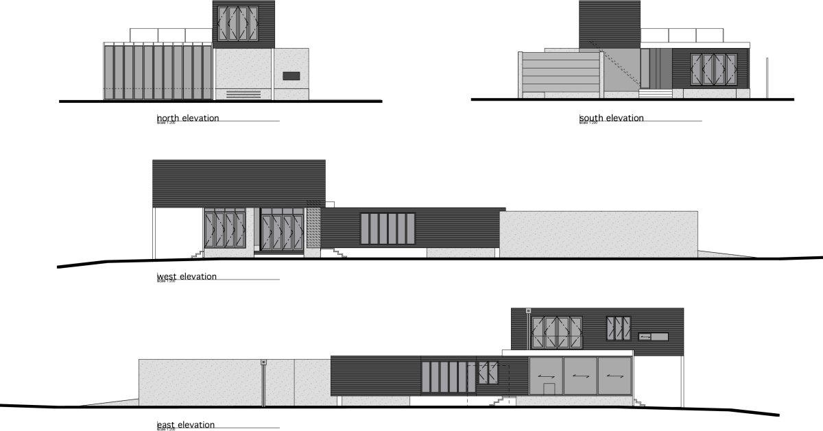 Formally the house consists of 4 main elements; (1) a concrete base, which at some points is folded up to contain interior spaces, (2 and 3) two black cedar-clad bedroom blocks, and (4) an open-plan white structured ‘veranda’.