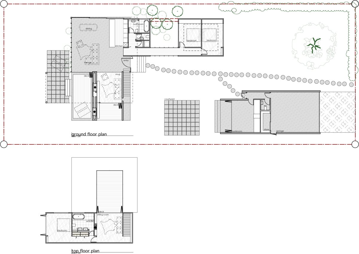 The concrete base provides the required floor level rise, creating intermediate zones between inside and outside. Raised decks from both the living room and snug articulate elevated, and in the case of the front deck, covered outdoor spaces. The living space arrangement suits the extreme climates of the location, activities and varying degrees of privacy.