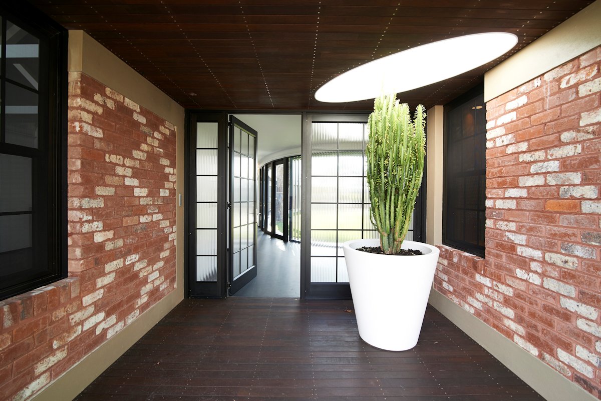 The publicly visible faces of the pavilions, aligned with the square geometry of the level block of land, are respectfully attuned to homogeneous character of the early 1900s federation era Subiaco streetscape – one of the best preserved suburbs in Perth – in the small scale of their pitched rooves, the updated interpretation of the traditional veranda that surrounds them, and the criss-cross pattern formed in the brickwork reclaimed from the dilapidated buildings that previously occupied the plot. This commitment to ensuring the new building’s façade is sympathetic with its period surroundings has led to it being enthusiastically adopted by the neighbourhood, yet stepping through the front entrance reveals this home to be anything but square.