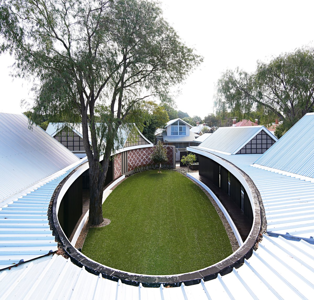 Viewed from the street this unassuming family home hides a secret; a cluster of interconnected pavilions with an oval courtyard garden at their centre.