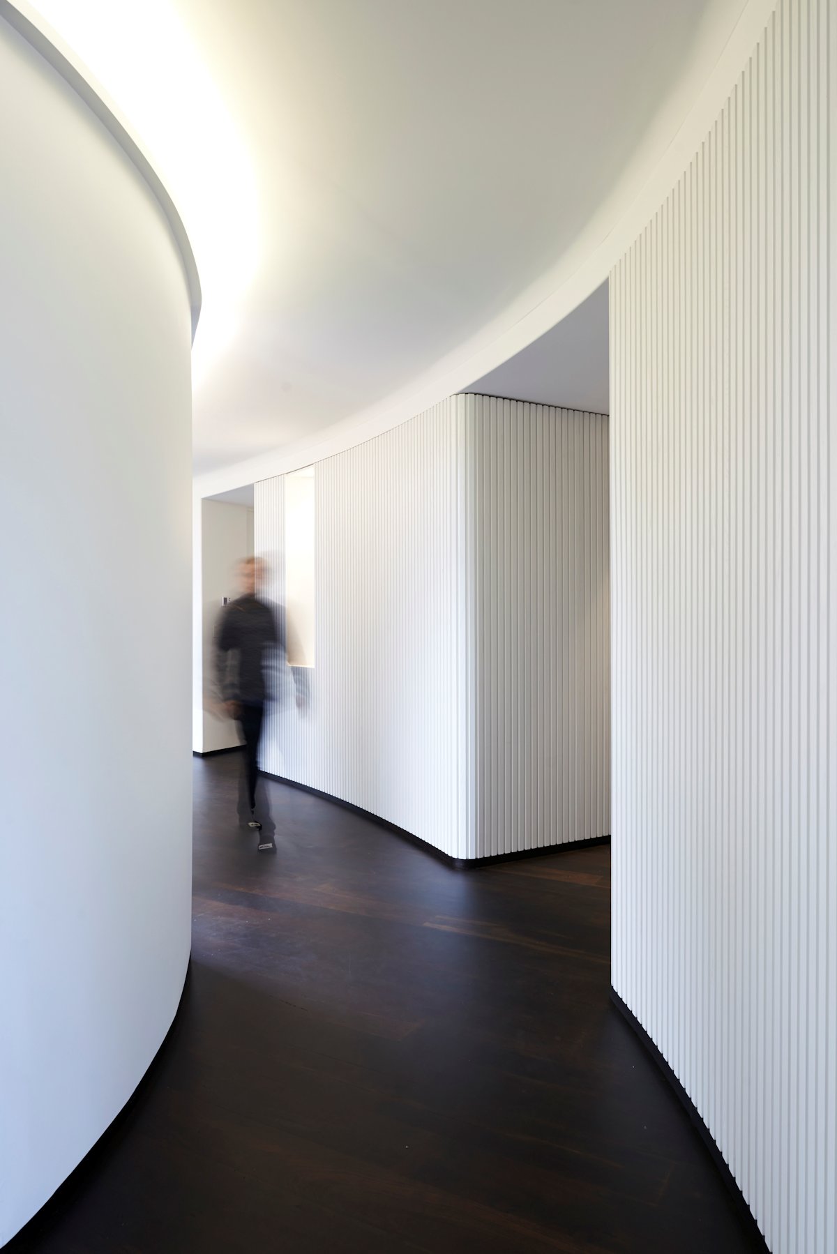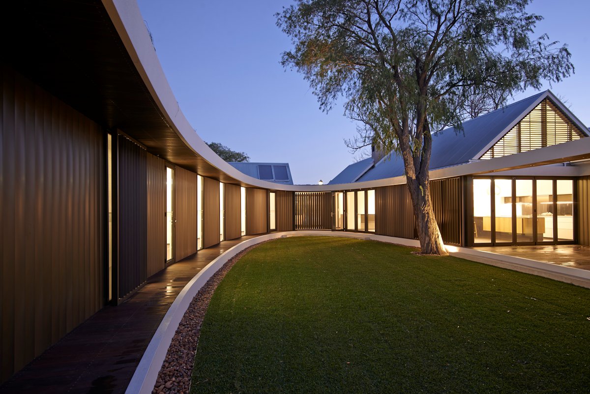 Externally the oval is bordered by another veranda with its Jarrah timber deck set at seat height, which provides the family with a theatrical open space to play and entertain that is visible and easily accessible from wherever they are in the house. It also showcases some of the more contemporary elements of the building in details such as the Luigi Rosselli Architects designed profiled aluminium wall cladding to the veranda and vertical sun shade louvres. Internally the courtyard lends its form to the surrounding buildings in the curves of the connecting corridors and partition glass panelling.