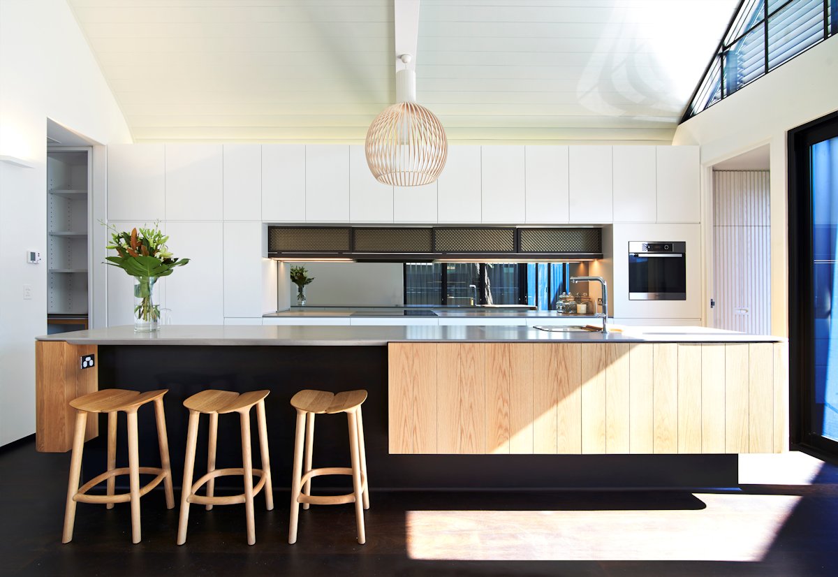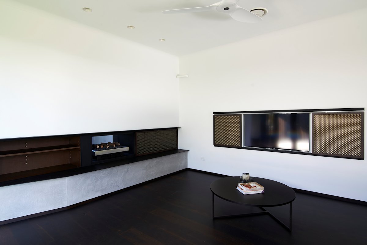 The interiors of the house reflect the constructive tension in its timeless aspects such as the pitched roof forms, enhanced with exposed timber trusses and painted tongue and groove lining boards, small paned windows and traditional French doors, with the more modern materials such as the polished concrete and black steel fire surrounds, contemporary joinery finishes and Scandinavian furniture.