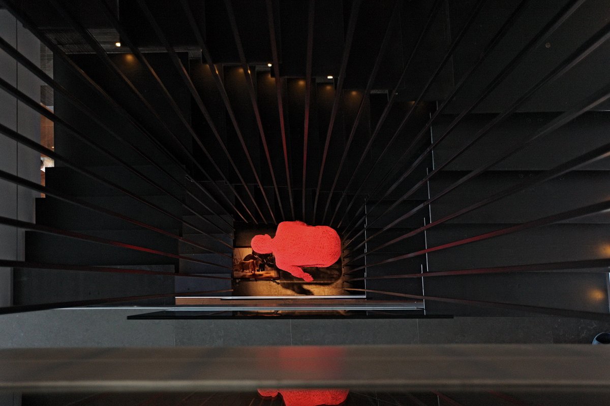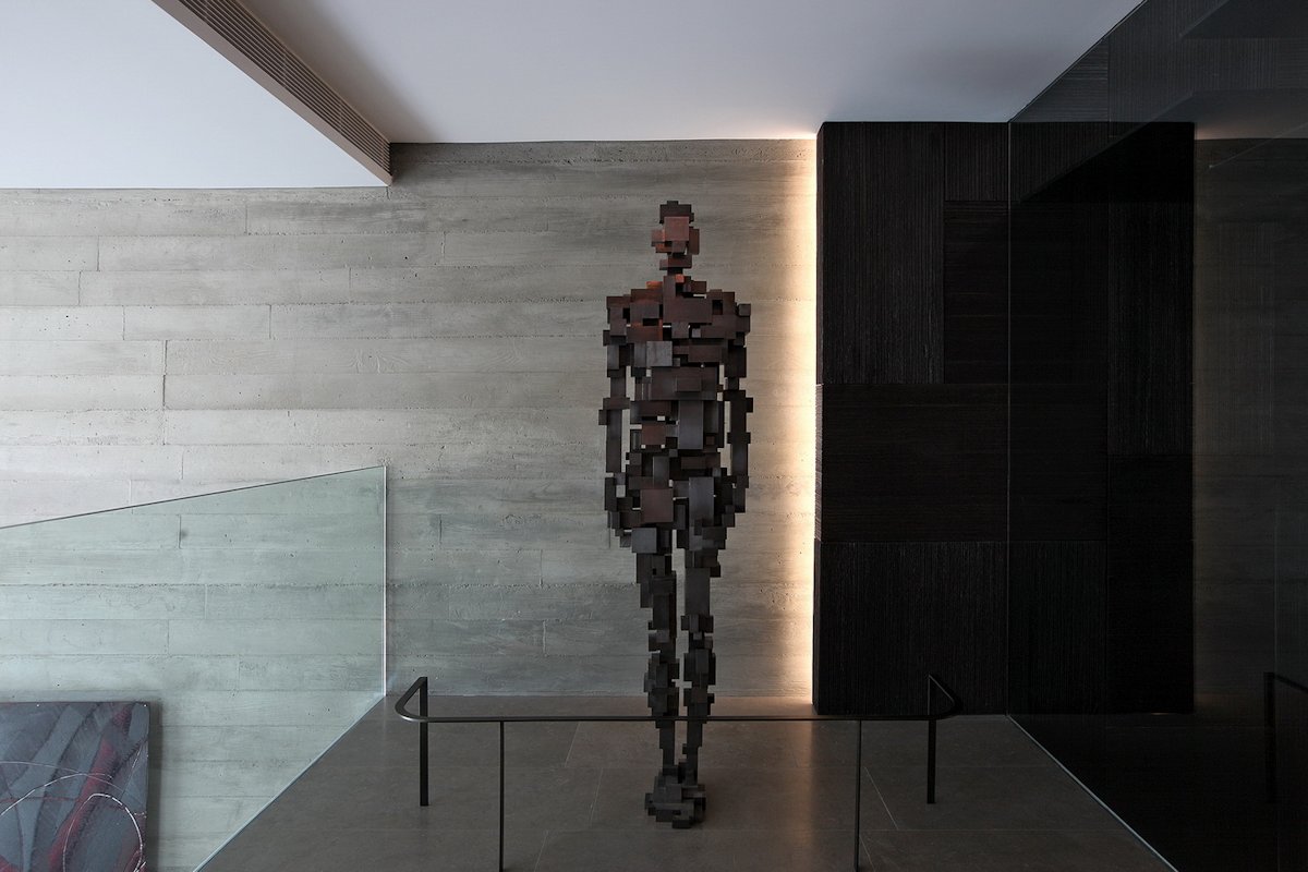 The polished marble tables are the most distinctive pieces of furniture. The smooth light colored marble surfaces on the tables and in around the staircase flooring complements the rough grey granite walls. The grained marble tops of center dining table and low table give the living room a distinctive look. These dark grey marble surfaces are present through these circulation areas continuing to the upper floor gallery. Wood wall panles placed in a square geometry in the staircase wall seems complementary with the heat treated iron. The use of these strong textures is the basis of the interior design of the T House and also is highlighted by the collection of in-built and free standing furniture and art work.