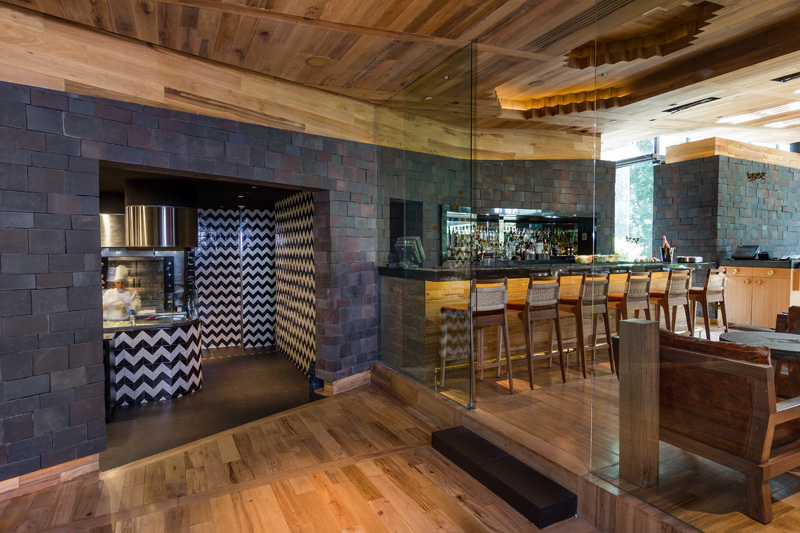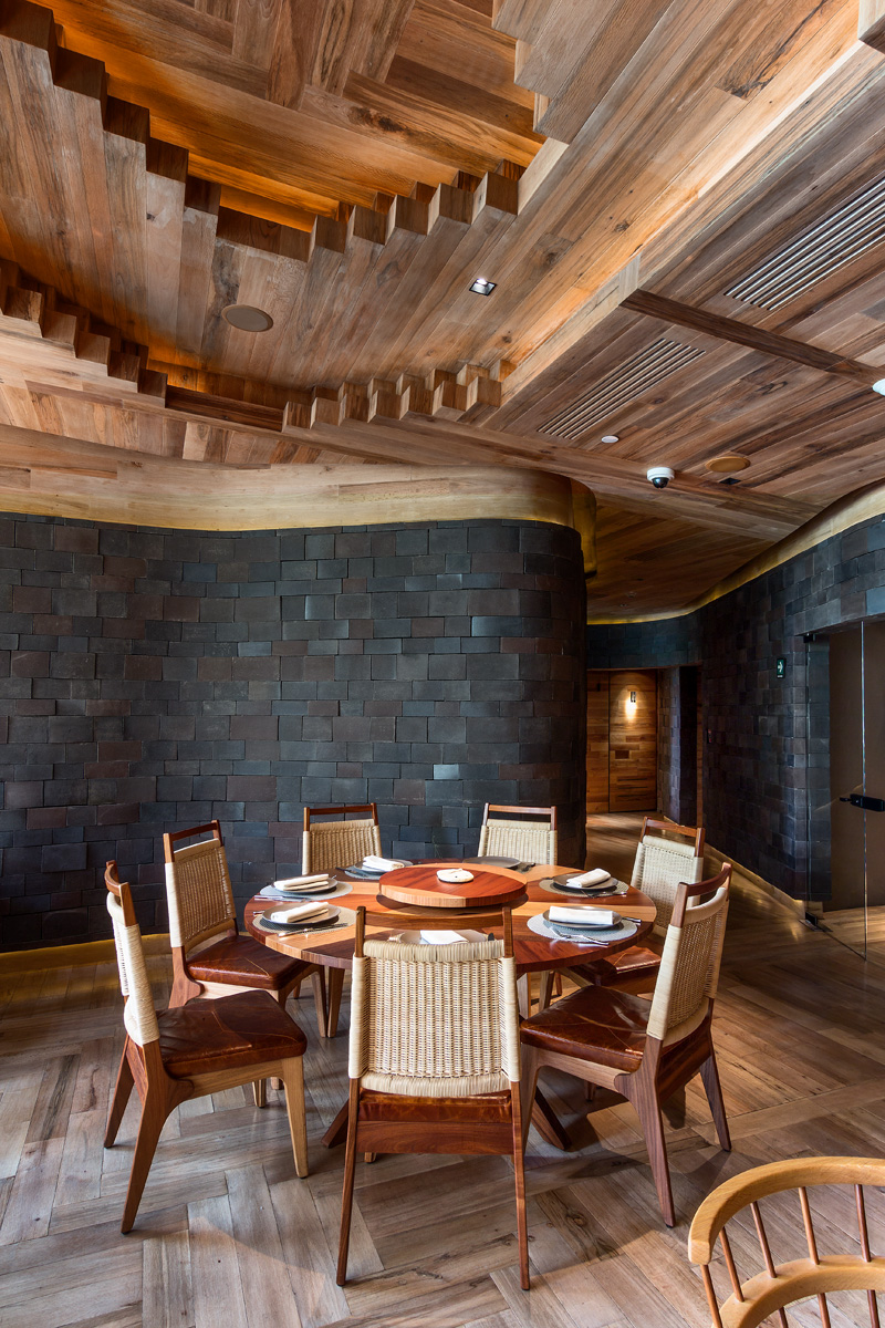 In the opposite side, the space is extended into an exclusive private dining room, with all the necessary amenities to host intimate events. In the middle of the room, a wide dining table that accommodates 25 people is found. Motifs alluding to the shapes of pre-Hispanic pyramids are repeated in the ceiling and on the far side of this area, there is a small living room from where the terrace and reflecting pool can be reached.