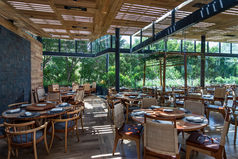 Aside this space, visitors can enjoy the dining area which is conformed by a series of tables and chairs designed exclusively for the project by mob studio: leather upholstered stools, chairs with wicker weaved backrests and geometric pattern decorated surfaces inspired by pre-Columbian cultures.