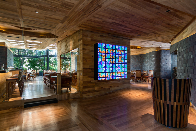 As the scents from the dishes and mezcal arise, a mural art piece consisting of kaleidoscopic digital mosaics greets the customers. This piece was made by visual artist Ignacio Rodríguez Bach and presents a series of images representative of the Chapultepec area, where the restaurant is located.