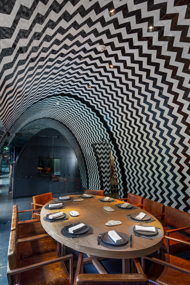 Located in the left end of the complex there is a private room specially destined for the Chef. Its vaulted ceiling is covered with a patterned arrangement of black and white glazed ceramic tiling, which is continued along the walls up to the kitchen limits. This room was created for the diners to savor the Chef’s delicacies directly, establishing a more personal relation.