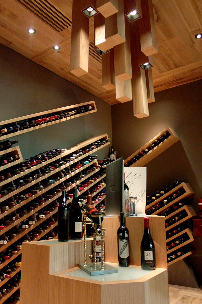 At last but not of least importance, next to the entrance hall the wine cellar is located. This space was particularly designed to house the wide variety of wine and mezcal brands offered in the restaurant; for this, wooden shelvings were built throughout the walls.
