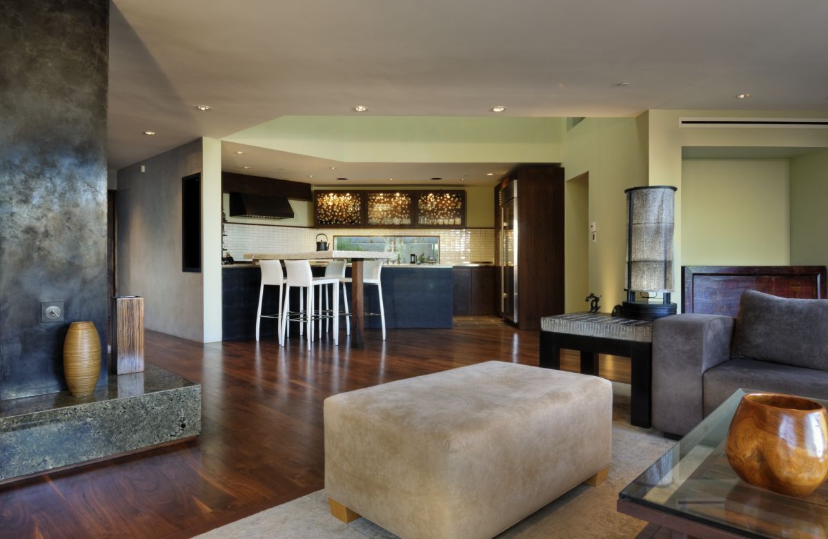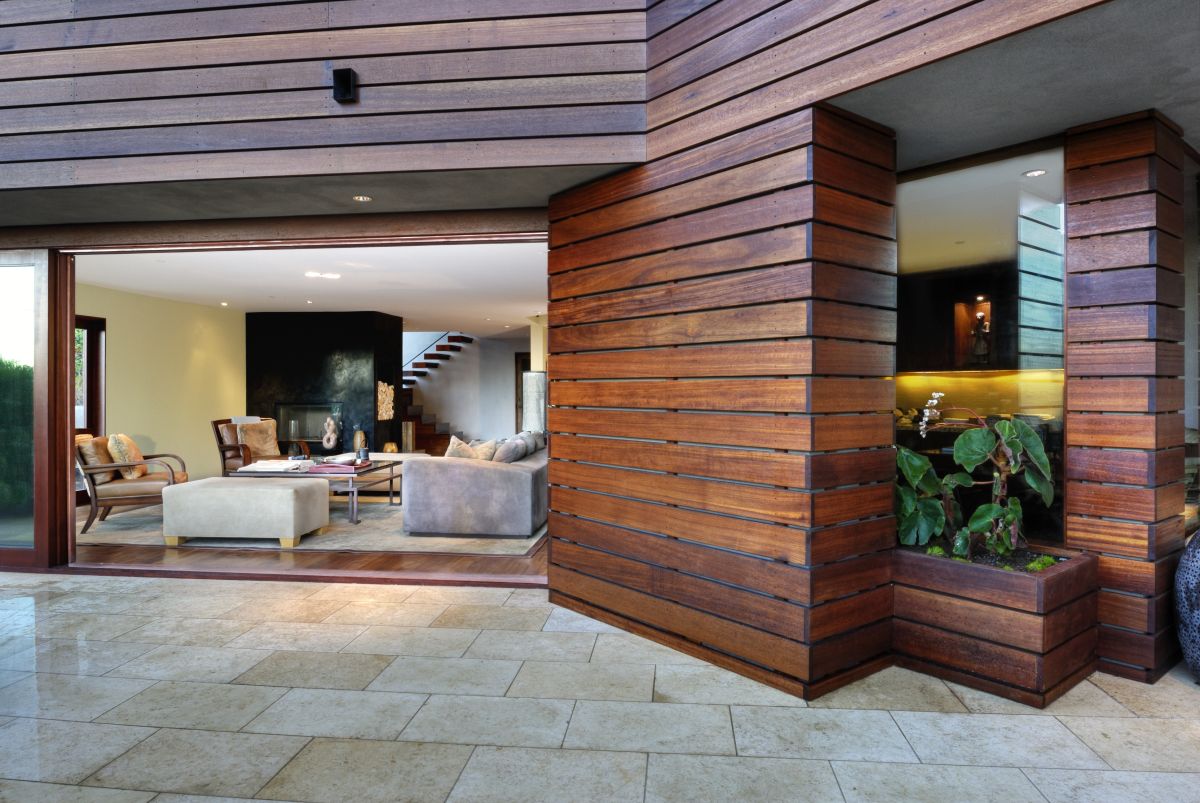 The owner, a frequent traveler to Thailand and Cambodia, desired a look that fused a South East Asian expression with a modern contemporary aesthetic. The approach was to incorporate rich natural materials, indoor-outdoor living and create dedicated areas to display the owners vast collection of artifacts. The exterior of the home is enveloped in red mangaris exterior wood cladding; indoor and outdoor spaces flow into one another through retractable doors, full height glass walls, and harmonized materials. Artifacts are peppered throughout in display nooks, on axis, and as focal points.