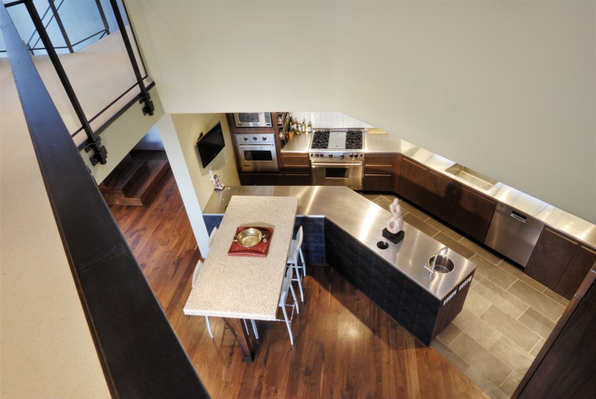 The entry leads into the main living room, the focal point of which is a large smooth Venetian plaster fireplace with granite mantle. A double height ceiling cut-out and black walnut flooring connects the living area to a chef’s kitchen, which features a custom-made stainless steel countertop, cabinets created from Roman Coin leaves cut into glass, and the kitchen window with garden views. The kitchen also includes Ann Saks crackled white tile and a custom-made pebble embedded dining table set against slate pavers.