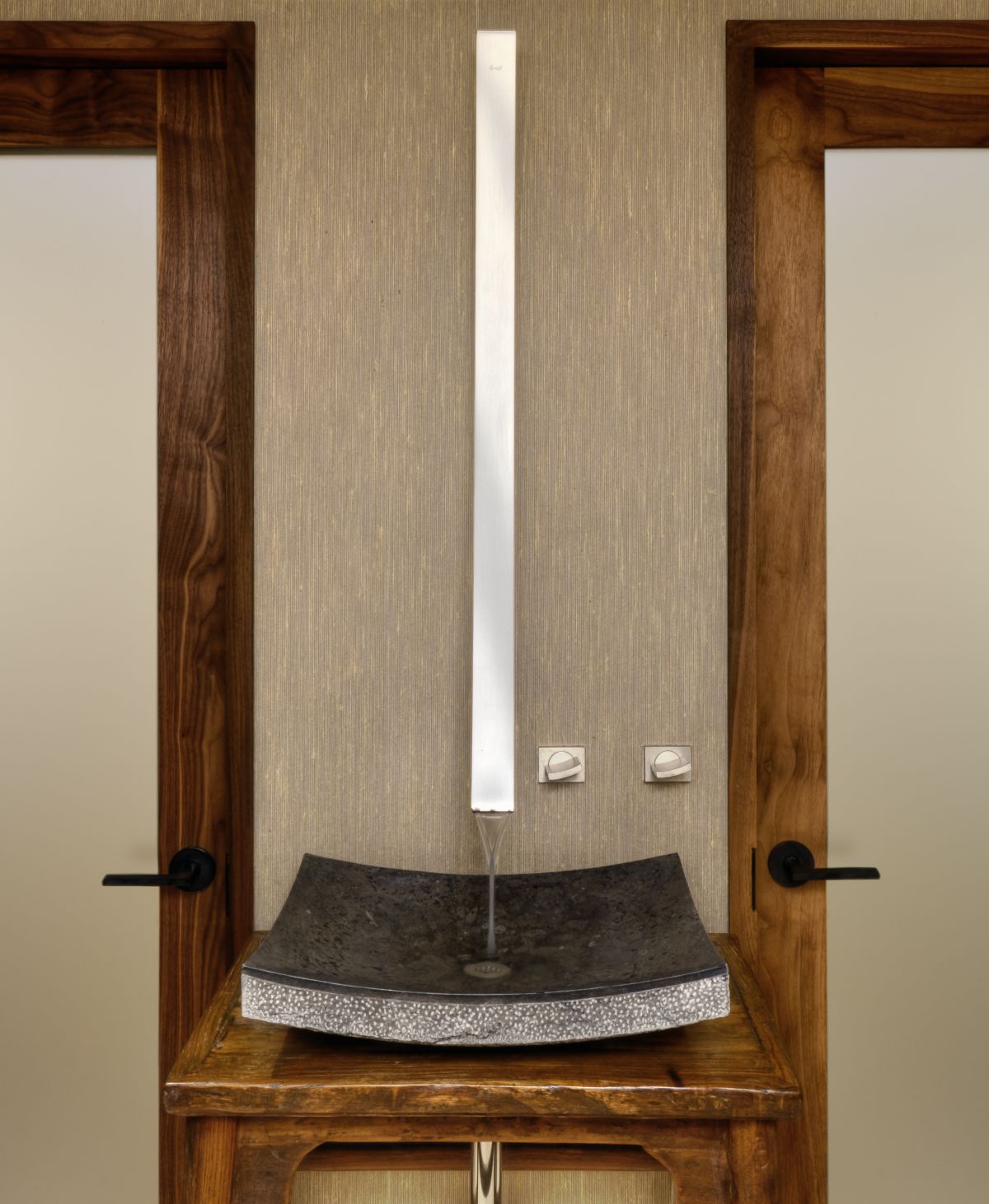 Off the main living room, a 300+ year old monastery door from South East Asia slides open into an office and the ground floor powder room leads to a bathroom and linen closet. The powder room is defined by a long stainless steel wall-mounted fixture that emphasizes a single antique Asian table with a granite basin. Upstairs, there are 3 bedrooms: a master, a guest room and child’s room, as well as 2.5 bathrooms. The windowed master bedroom includes a linear gas fireplace with a granite mantle that ties seamlessly with the 100% silk carpeting that mirrors the marbling of the granite. The luxurious master bathroom is completely inset in jade, from the floors all the way to the bathtub. Next door, the distinct children’s bathroom features a neo-metro apple green resin sink.
