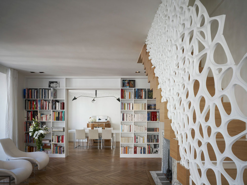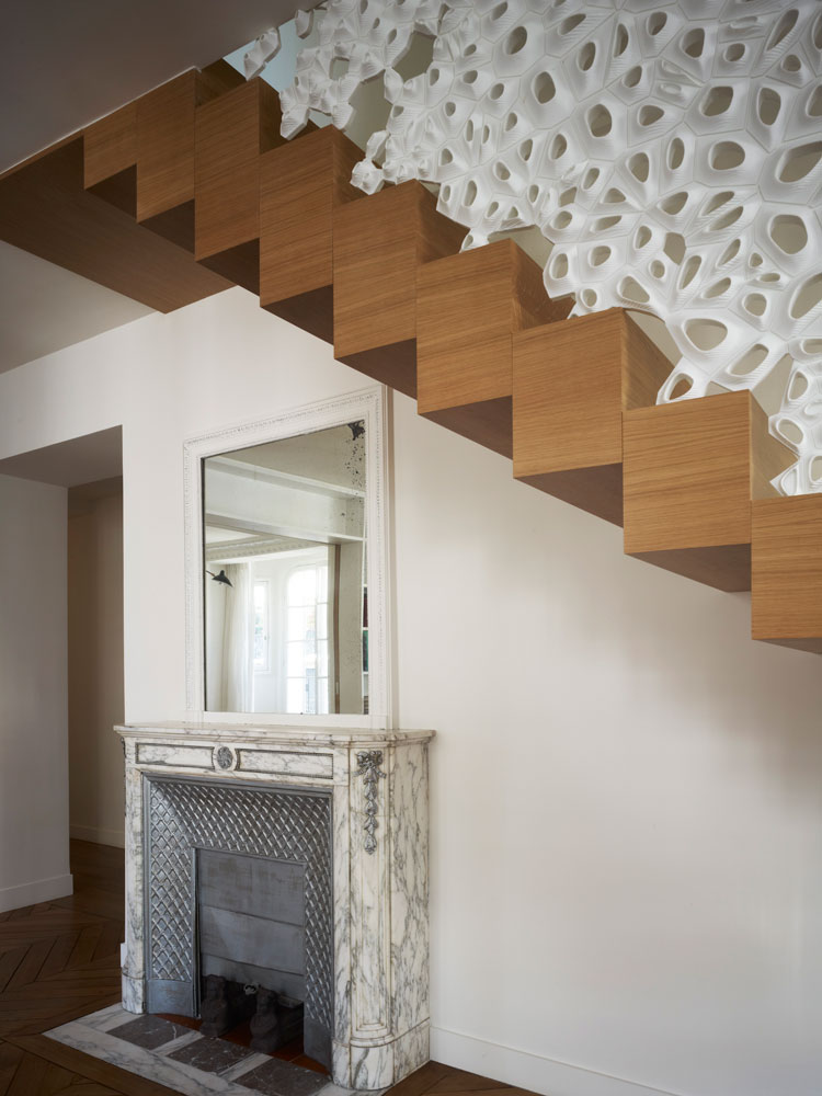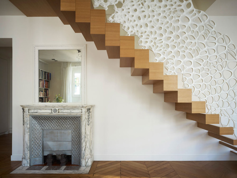MARC FORNES / THEVERYMANY, together with architect Ammar Eloueini, designed this sculptural handrail made from Corian, for an apartment in Paris, France.