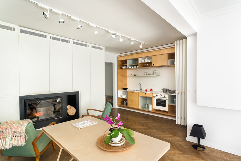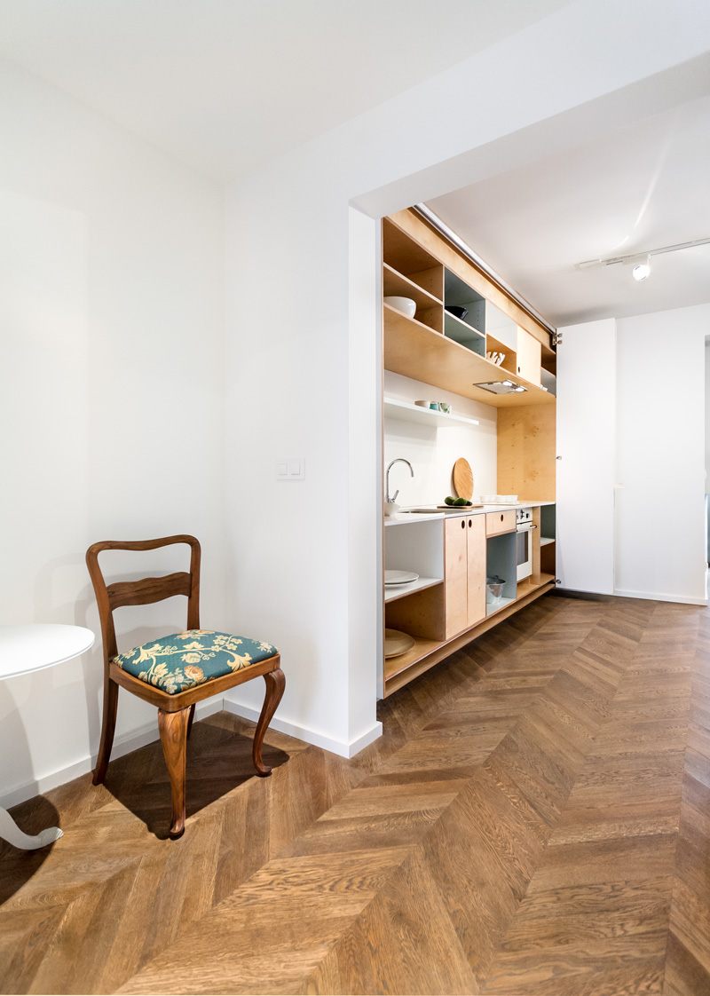 This Apartment Has A Hidden Kitchen by Erin Miller on June 17, 2015 When dontDIY were asked to design this apartment in an old building in Sofia, Bulgaria, they hid the kitchen behind a wall of folding doors. Design: dontDIY Photography by Asen Emilov