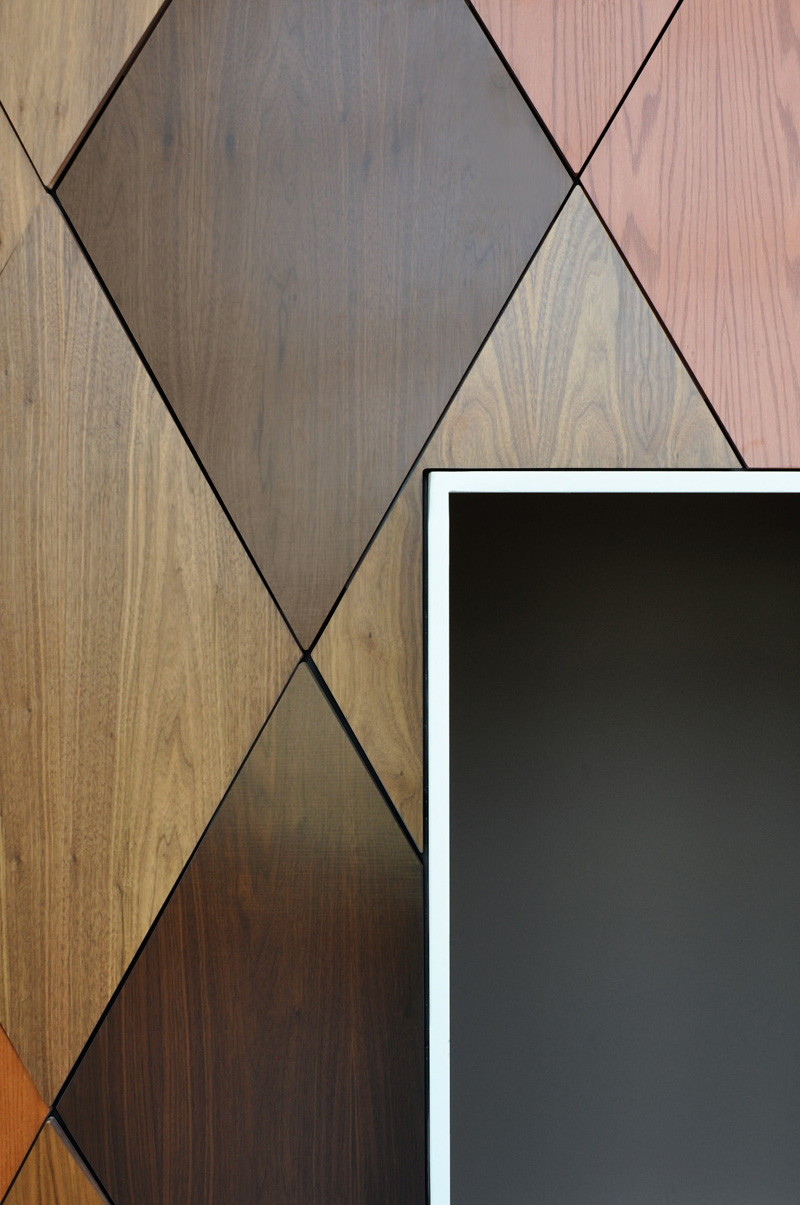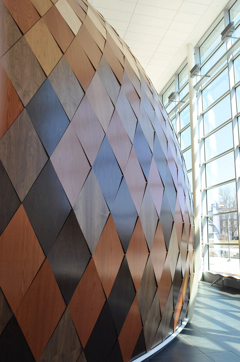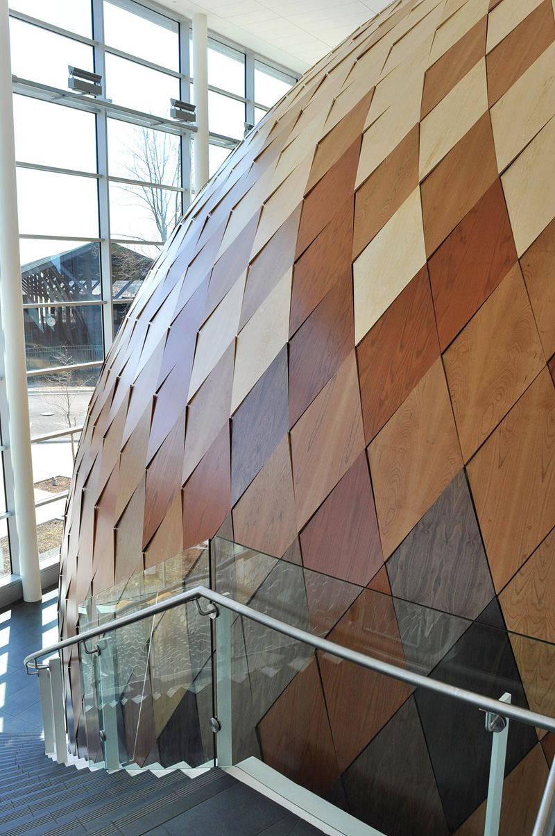 Cladding for the Immersive Theater was designed to exist as a natural, organic component encased in a clean white modern box. By using six species of wood veneer, a pixelated gradient is created that moves up through the dome from dark to light. This is conceptually intended to mimic the natural aging characteristics of materials that are exposed to the elements. In this way, the object seems as if it had always been in this place – an artifact that has been preserved by the surrounding building.