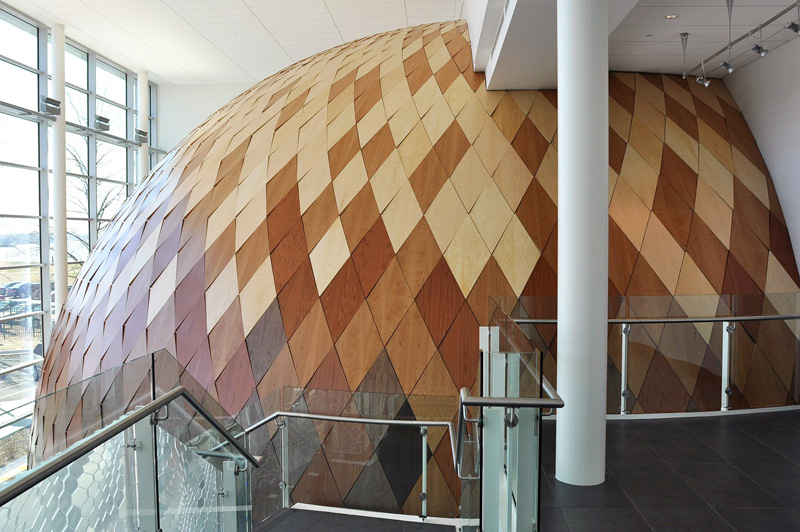 PROJECTiONE have clad this dome-shaped theater entrance in 1500+ unique panels made from 6 different species of wood veneer.