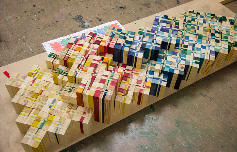 Inspired by checked patterns, the grid arrangement of the coloured blocks introduces what we usually see in textiles into three dimensional wooden piece.