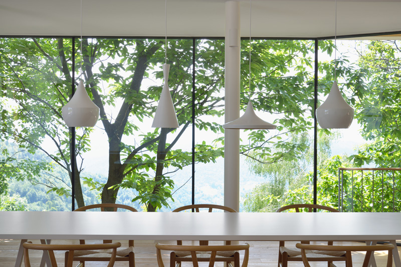 At almost seven hundred meters above sea level, the building is set into the space, in a way that is most respectful to the natural environment. The plot is extremely long and narrow, very steep too, the slope spans eleven meters in altitude.