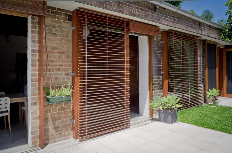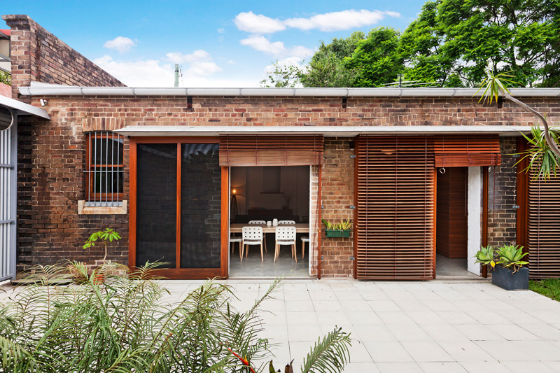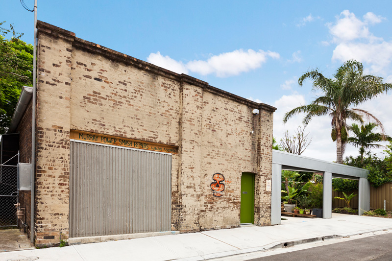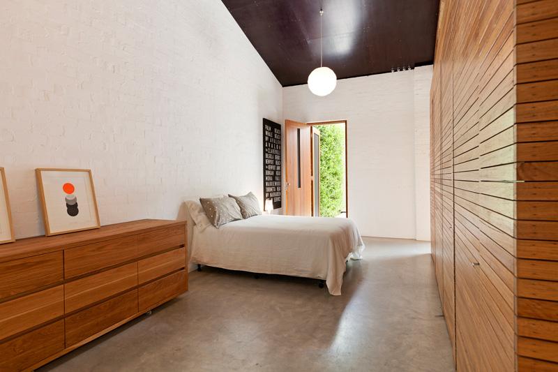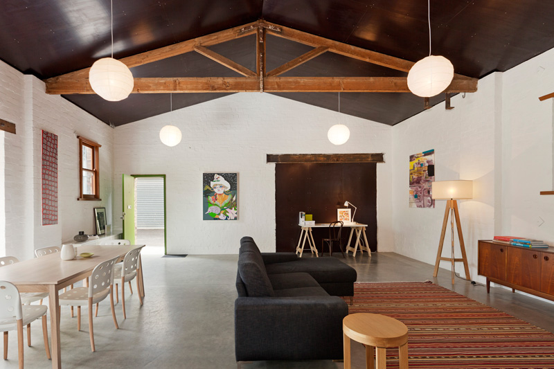 Architect Richard Smith designed the conversion of an old brick building in Sydney, Australia, that was once an auto repair shop, into a home with cathedral ceilings and exposed timber beams.