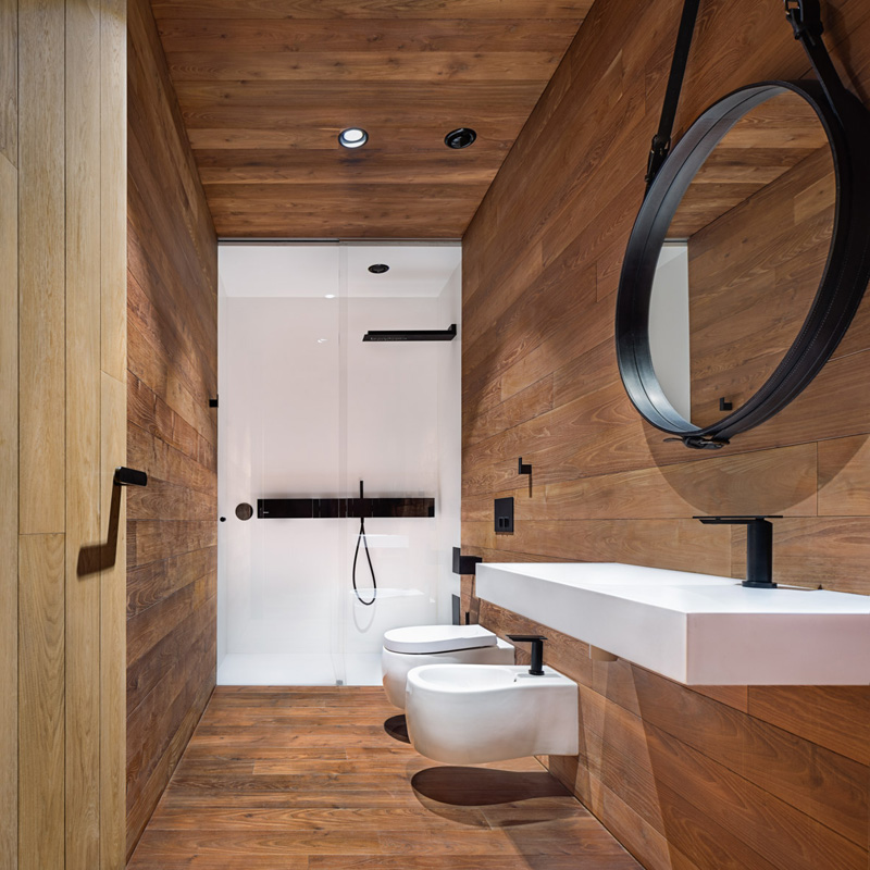 The materiality of the interior spaces is dominated by local species wood cladding, which balances the roughness of the entire structure and its surroundings.