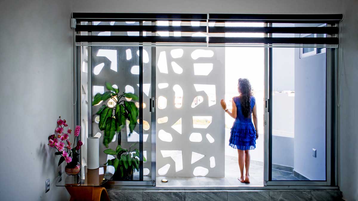 The design of the Screen pays tribute to an abstract interpretation of traditional textiles made by the indigenous community of Chiapas, with repetitive geometric shapes. The pattern designed to look like random provides those inside an unnoticeable look of what’s going on outside at the same time allowing daylight to wash the interior of the balcony and the bedrooms creating a luminous atmosphere and an interface between interior and exterior.