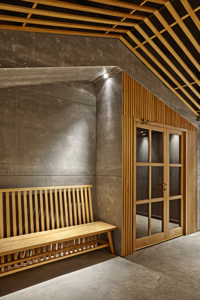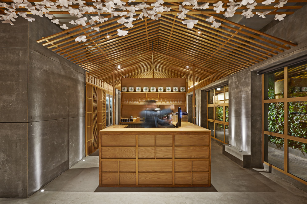 Arriving to the restaurant you can see how these two aspects are attracting the attention. The concrete from the facade and the entry that clearly represents the classic Japanese carpentry.