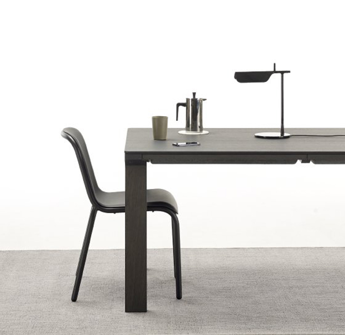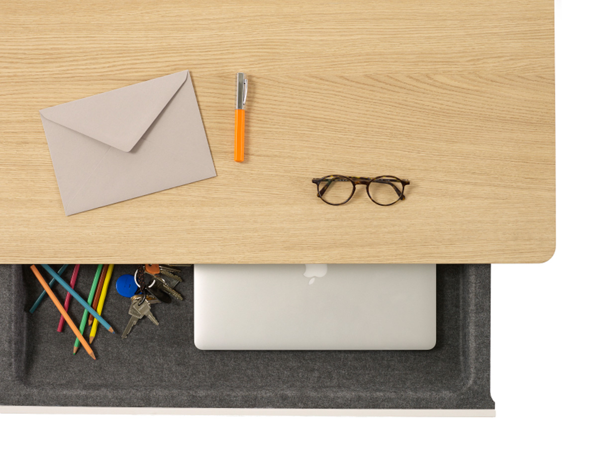 It looks like a simple, modern table, but it hides an impressive secret: virtu¬ally invisible drawers that are small enough to not have to compromise on leg room and big enough to be able to put away or get out laptops, placemats, cutlery, and all those things that are always lying around, like keys, pens, paperwork or phone chargers.