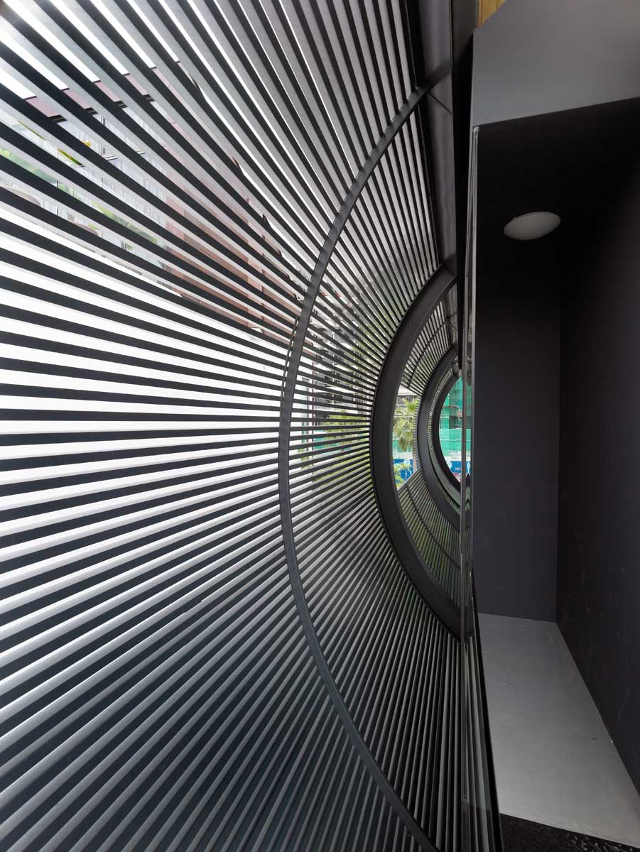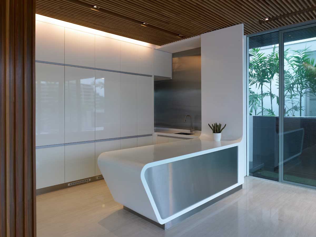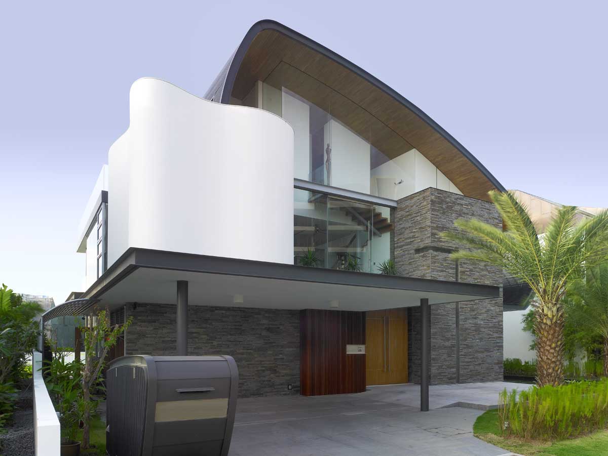 This nautical themed eco-friendly waterfront house in Singapore has a sinuous wave envelope with wide overhangs that provide shading for the hot Eastern and Western sun, and opens up to the North and South. The underside of the ceiling is clad in recycled teak, reminiscent of a boat hull. Extensive low-e glazing affords views of the waterway to the North and South China Sea to the South. Good natural cross ventilation is provided when the large sliding glass doors are opened to allow cool sea breezes to flow through the spaces. Recycled timber used externally for decking reduces heat gain.