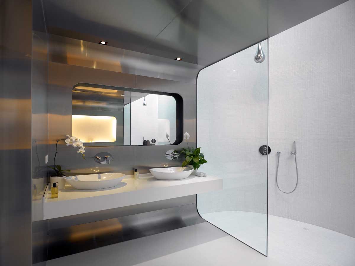 Where there is no view of the ocean, the walls and built in elements of the spaces are curved to give a constant reminder of the seafront context of the home. For example, the master bathroom walls are flowing curves with a shaded skylight over to afford views of the sky and curved roof above. The walls, floor and ceiling of the bathroom form a sinuous curved envelope clad with stainless steel, and all bathroom fixtures including basins, water closet’s and shower fittings echo this fluid curvaceous nautical theme.