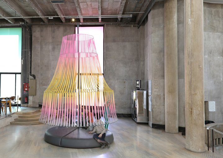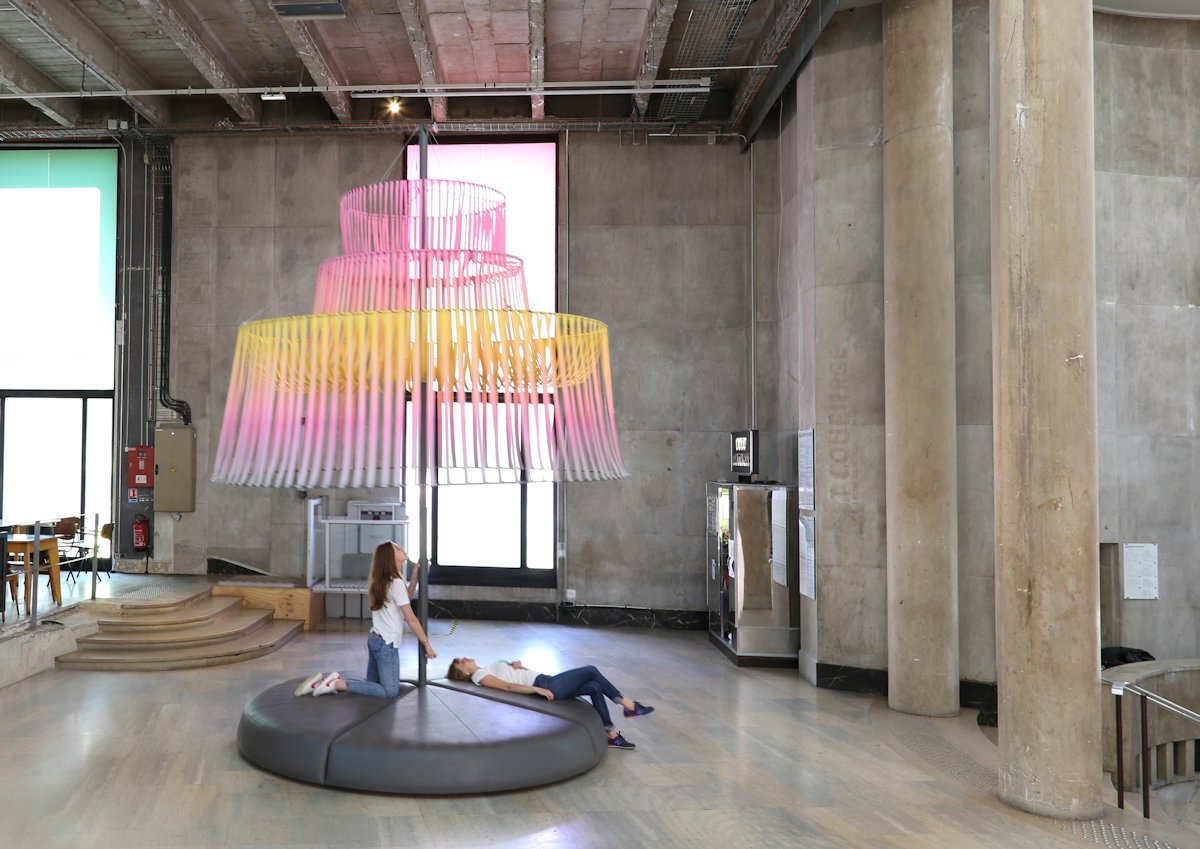 Above the comfortable surfaces, mats are erected supporting a plaiting of straps and carbon circles. They stand and metamorphose in a graphic semi-transparence.