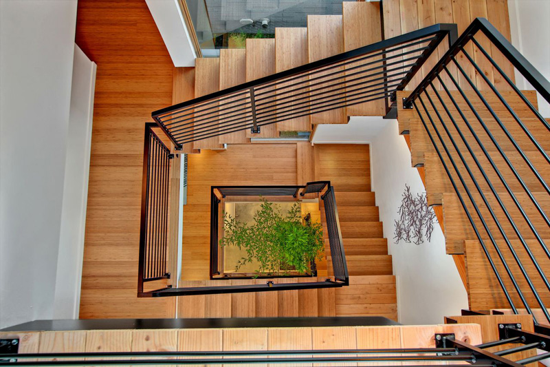 The interiors are stacked by use. The utilitarian entrance level includes the an flex space and bath, and guest bedroom. The second floor offers an open-plan kitchen, dining and living space.