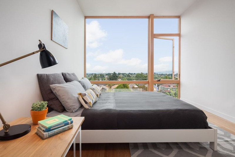 Glazing frames the views of the Cascades and Lake Washington to the west and downtown Seattle to the east. The entry paths to each unit are designed to foster casual interaction between the occupants.