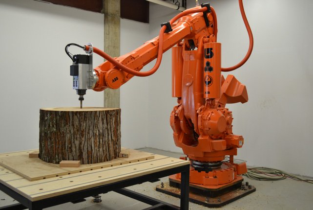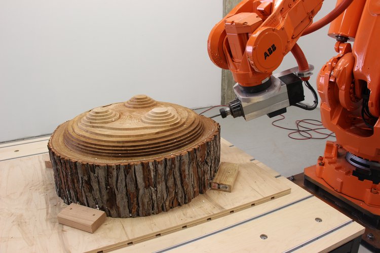 With this first pass, the robot removed the majority of the excess material, including the bark and carved the basic forms of our design. Like terracing. We liked the patterns that emerged from this stage.