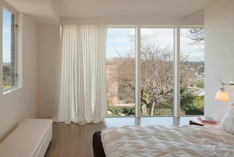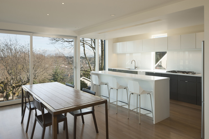 The traditional, street facing facade remains untouched, concealing the dramatic change to the interior and rear facade. Given the clients goals for cleanly detailed spaces oriented to the northern view of the Ship Canal, the rear facade of the existing house was blown open and replaced with an aperture that spans the entire width of the structure.
