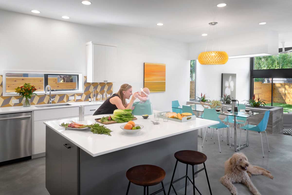 Balanced shade, dappled sunlight, and tree canopy views are the basis of the 518 Sacramento Drive house design. The entry is on center with the lot’s primary Live Oak tree, and each interior space has a unique relationship to this central element.