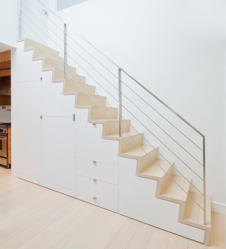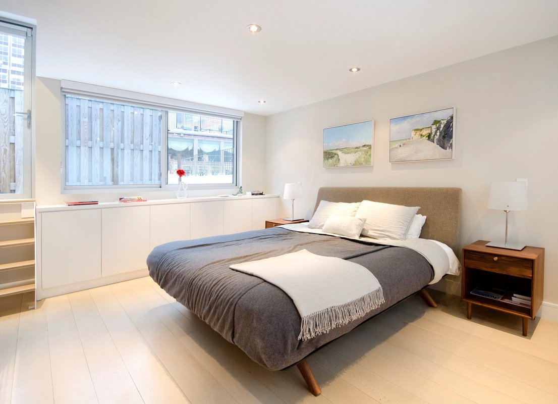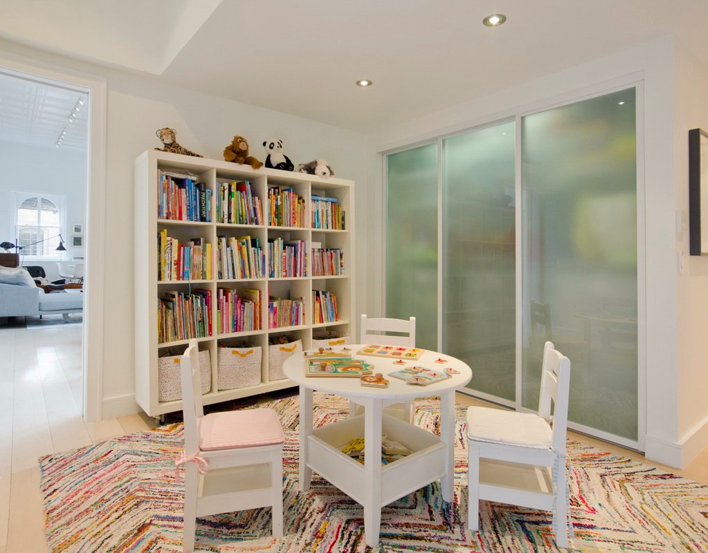 StudioLAB aimed for a fluid open-plan layout in the larger public spaces while creating smaller, tighter quarters in the rear private spaces to satisfy the family’s programmatic wishes. 3 small children’s bedrooms were carved out the rear lower level connected by a communal playroom and a shared kid’s bathroom. Upstairs, the master bedroom and master bathroom float above the kid’s rooms on a mezzanine accessed by a newly built staircase. Ample new storage was built underneath the staircase as an extension of the open kitchen and dining areas. A custom pull out drawer containing the food and water bowls was installed for the family’s two dogs to be hidden away out of site when not in use.