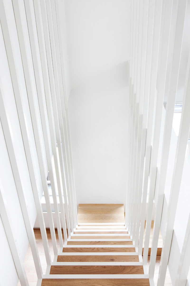Staircase: The centrepiece of the apartment is the feature staircase connecting the two levels. A modular, powder coated, white steel stair is suspended between the joists and connects to a low storage/sofa unit that runs along the front facade.