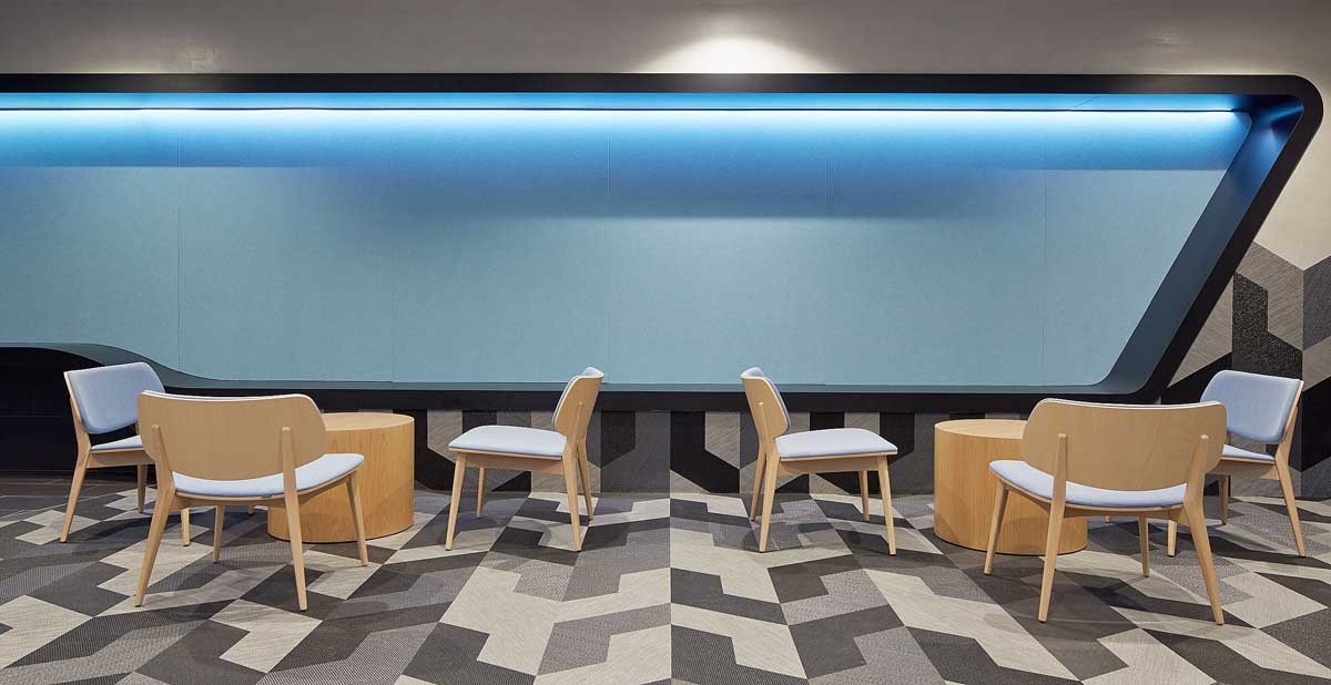 The external façade of the building is a striking composition of light and dark materials along with angular shapes and ovals. We were able to carry these interesting elements of the external façade into our interior design of the public spaces.