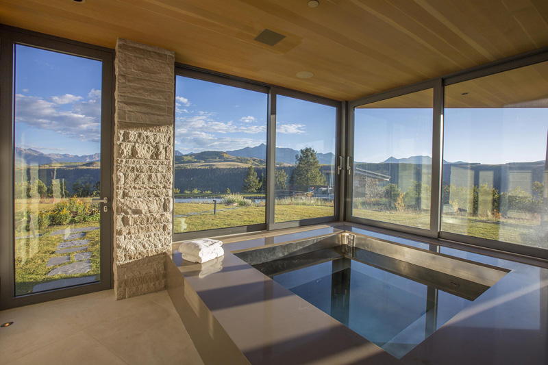 Architect Bill Poss, together with the current owner, designed this home in Telluride, Colorado, that is located above a cliff on a private peninsula, with amazing views of the surrounding mountains.