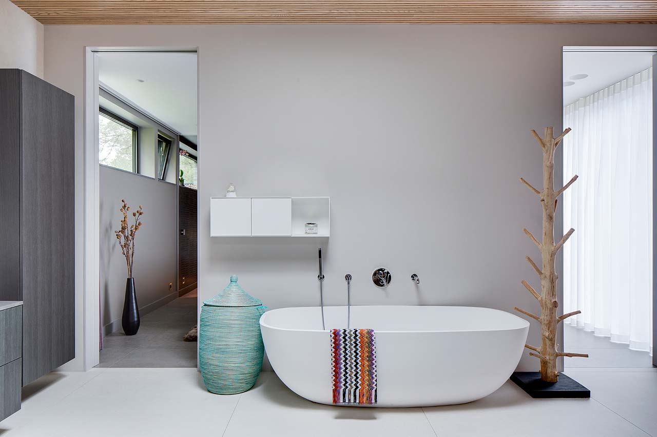 The floor plan is an attempt to merge different room types without the bulk of unnecessary walls and doors, with spaces opening onto each other in clear sequence and often with subtle shifts. Villa J can provide room for socialising or seclusion – even simultaneously. The main axes of the plot, the house and the garden work in symphony to create multiple unorthodox angles. The composition draws on an aesthetic somewhere between collage and a more austere expression.
