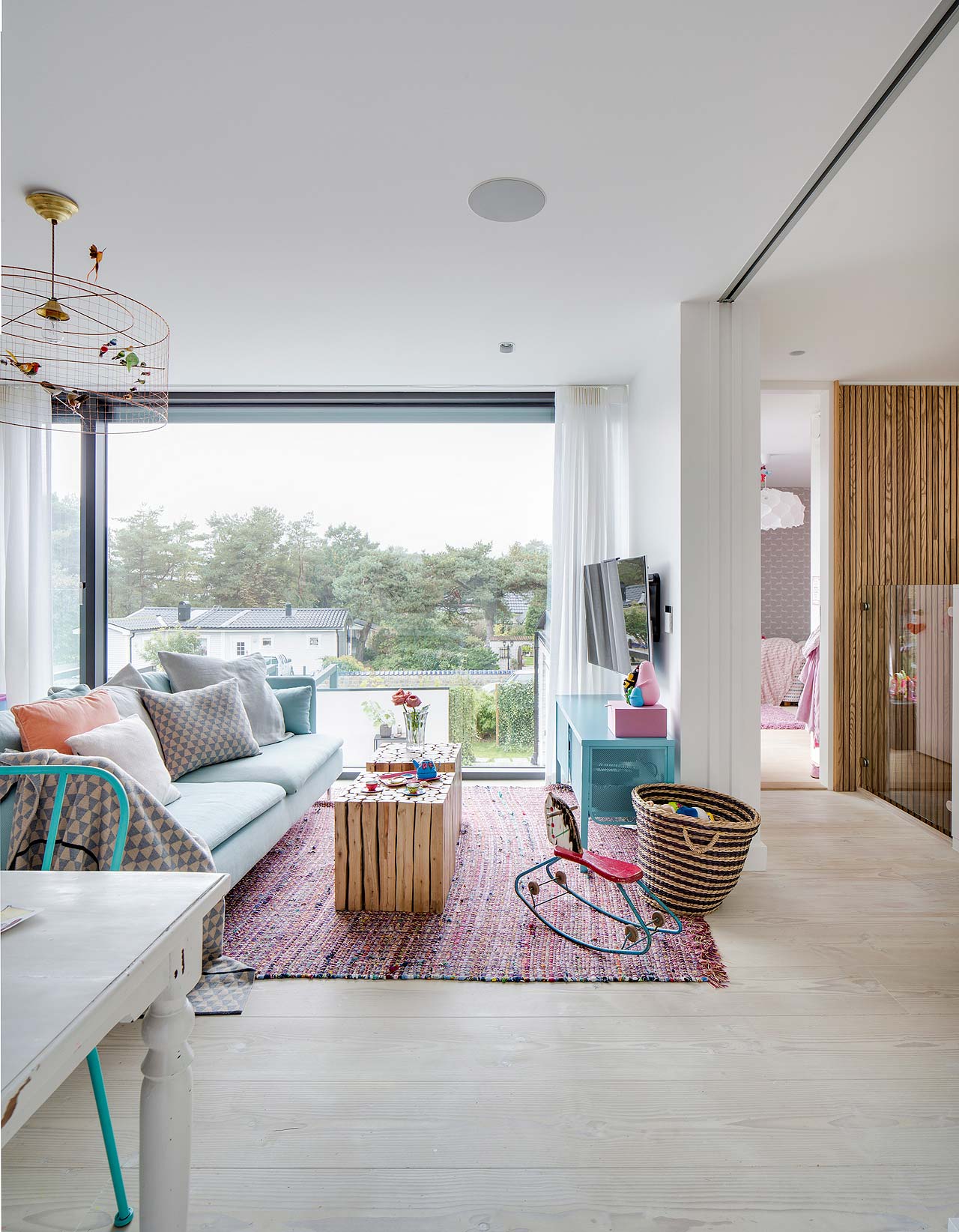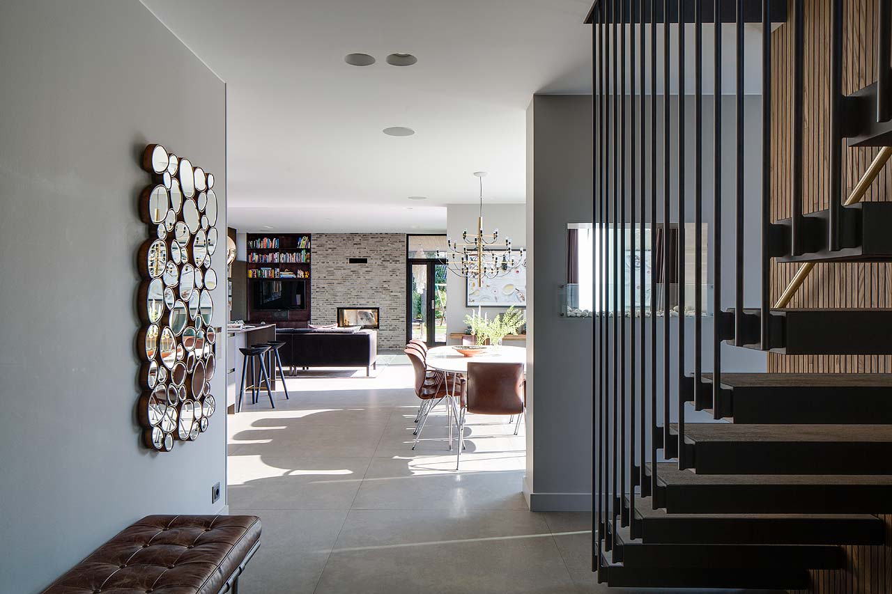 An atrium, secluded by walls and a pool house, unites the interior and exterior spaces. On the ground floor are the master bedroom and several ample social spaces, as well as a winter garden, kitchen, sauna, etc. The upper floor is the children’s realm, comprising a living room, bedrooms and a sizable family bath.