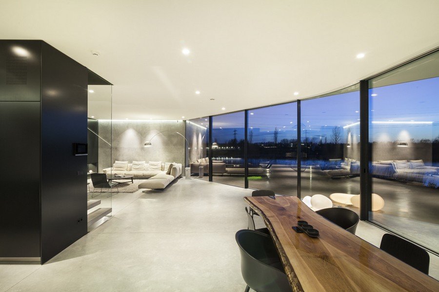 By introducing a spectacular concrete structure we made it possible to create a ground floor plan with maximum transparency, without any columns. This transparency increases the interaction with nature and the relationship between inside and outside. On the south side the glass facade is bended inward, creating an intimate and covered terrace. The contrast between the concrete facades and the folding glass reflect the changes of the nature around.