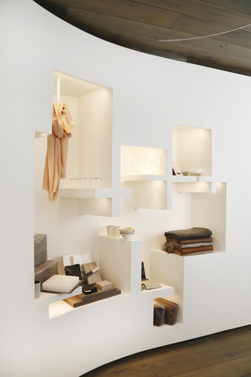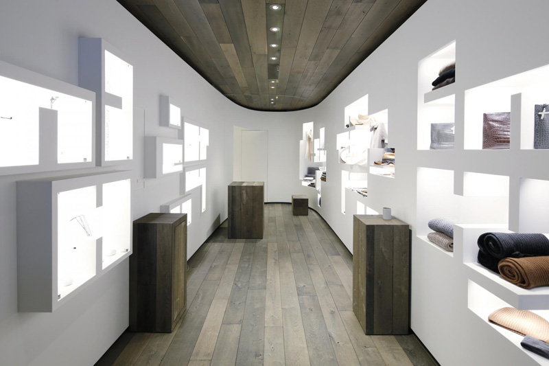 The inherent intimacy of the existing retail space at 994 Madison Avenue means that the experience of LJ Cross store is completely immersive. The space is completely coated in material; the walls of sculpted white corian and the ceiling and floor in a warm and textured Belgian wood.