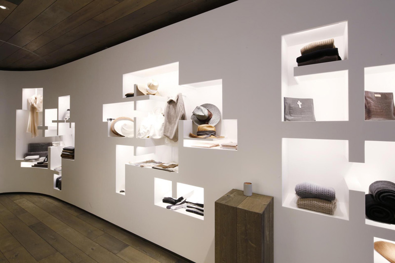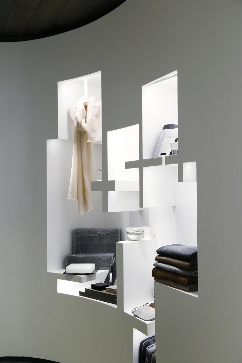 To maintain the sense of immersion, the displays themselves are meant to feel as if they are a part of the sculpture of the space. Instead of individual cases or racks that simply occupy the retail space as objects, the LJ Cross displays are carved from the Corian wall surfaces. On one side, the wall surface is carved outward, creating floating jewelry display cases. On the other side, the wall surface is carved inward creating shelving and display for the clothing and accessory portions of the LJ Cross line.