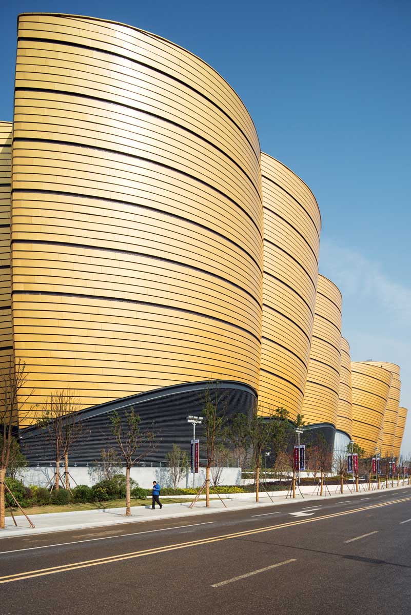 There are 24 bells in total, and each undulating shape is covered in bespoke geometric aluminum panels; all 11,000 of the gold panels are covered in a fluorocarbon paint that allows the cladding to self-clean as it rains. Strips of LEDs fill the 100 mm gaps in between the horizontal rows of paneling. They wrap around the massive, 60m tall bell shaped structures and make Wanda Movie Park glow vibrantly at night.