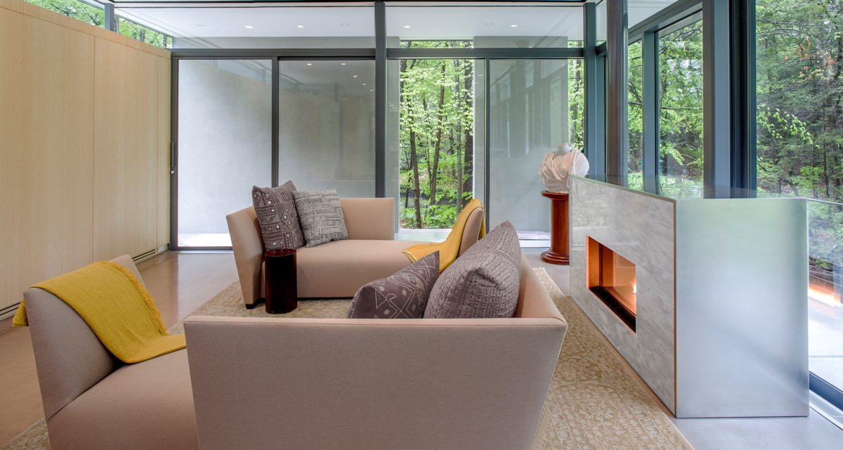 Interior and exterior spaces are joined through views, portals, and material continuity. A glass-backed fireplace provides an elegant surprise. Like other glass houses, the landscape becomes the “decoration” for the rooms, playing with transparency during the day and reflectivity at night.